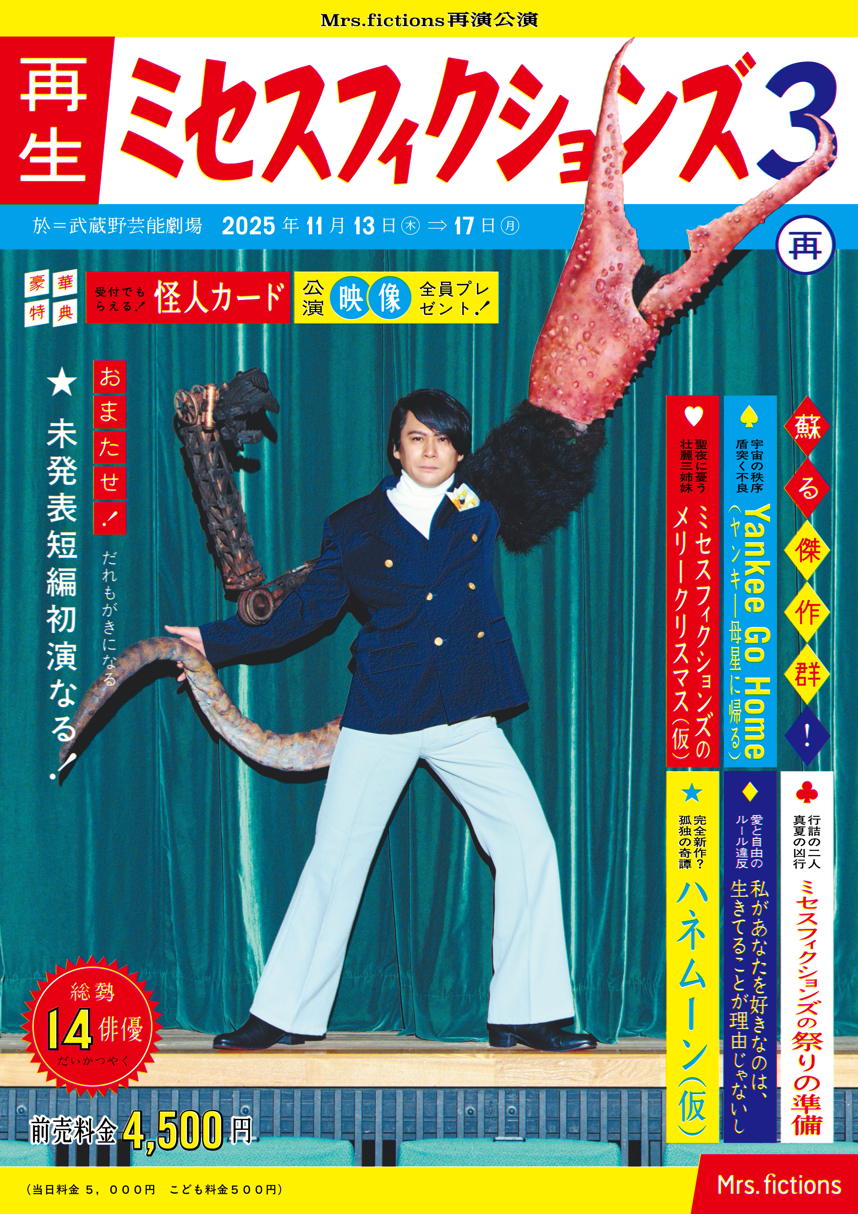 2015年、2018年にそんな理屈をこねつつ、過去に上演した短編を【再生怪人】になぞらえて再演し好評を博した『再生ミセスフィクションズ』が、7年ぶりの大・復・活!3と銘打っていても要は短編集なので1と2を観ていなくても問題ない上に、表紙の怪人も本編とは無関係の、コンセプトが生んだ化け物です。今回もチケットの代わりに怪人カードがもらえたり、本編丸ごと収録した動画を後日ご来場者全員にプレゼントしたりと盛りだくさん!