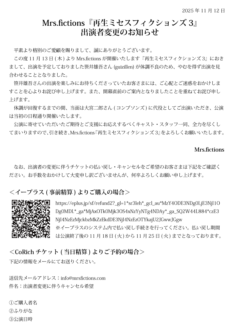 →『再生ミセスフィクションズ3』出演者変更のお知らせ